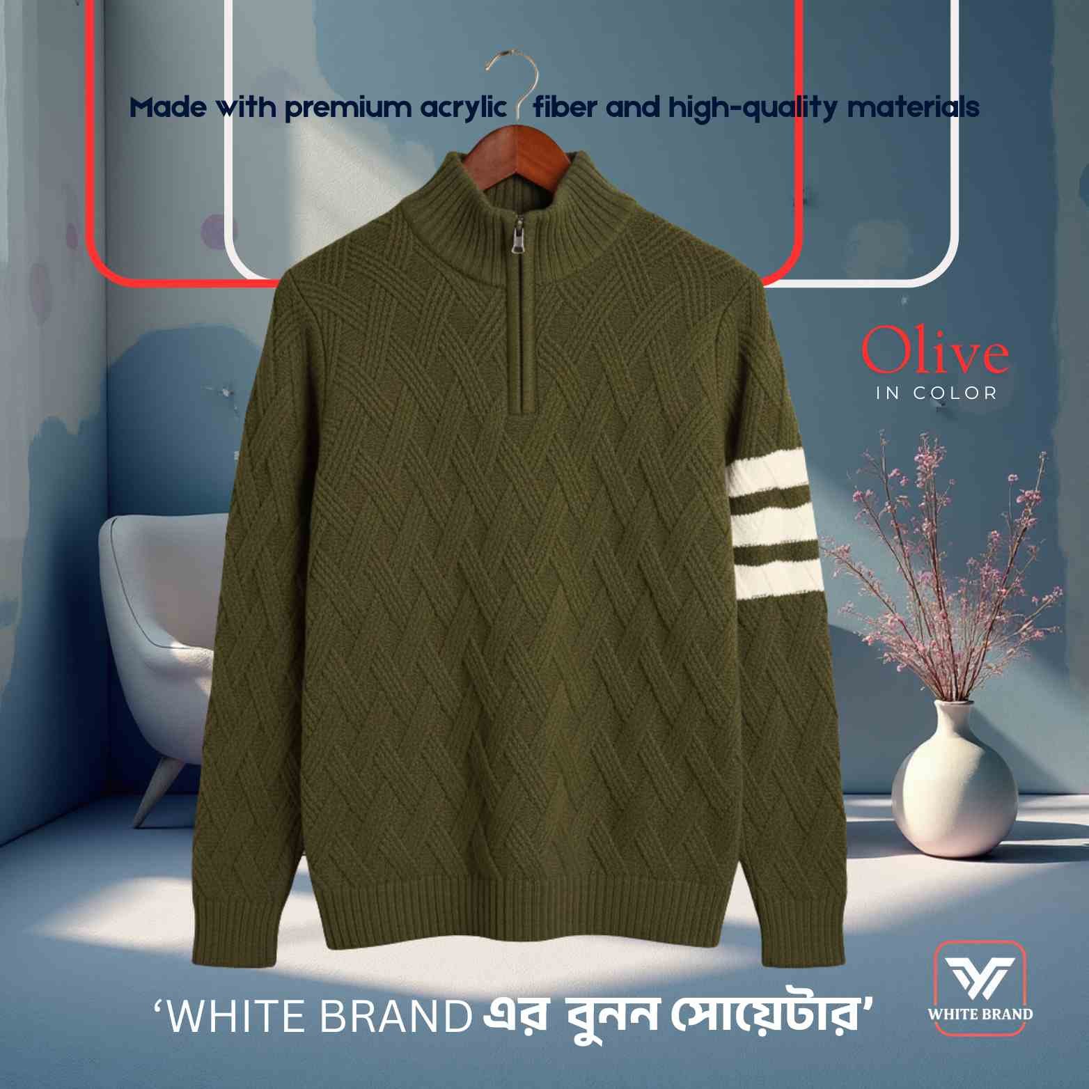 WHITE BRAND উপস্থাপন করছে প্রিমিয়াম অ্যাক্রিলিক ফাইবারে তৈরি হাই-কমফোর্ট বুনন সোয়েটার—যা স্টাইল, উষ্ণতা এবং আরামের নিখুঁত সমন্বয়। প্রতিটি সোয়েটার তৈরি করা হয়েছে উন্নতমানের ম্যাটেরিয়াল ও ফাইন স্টিচিং টেকনিক দিয়ে, যাতে শীতকালে আপনি পান লাক্সারিয়াস ফিল ও লং-লাস্টিং ডিউরেবিলিটি।